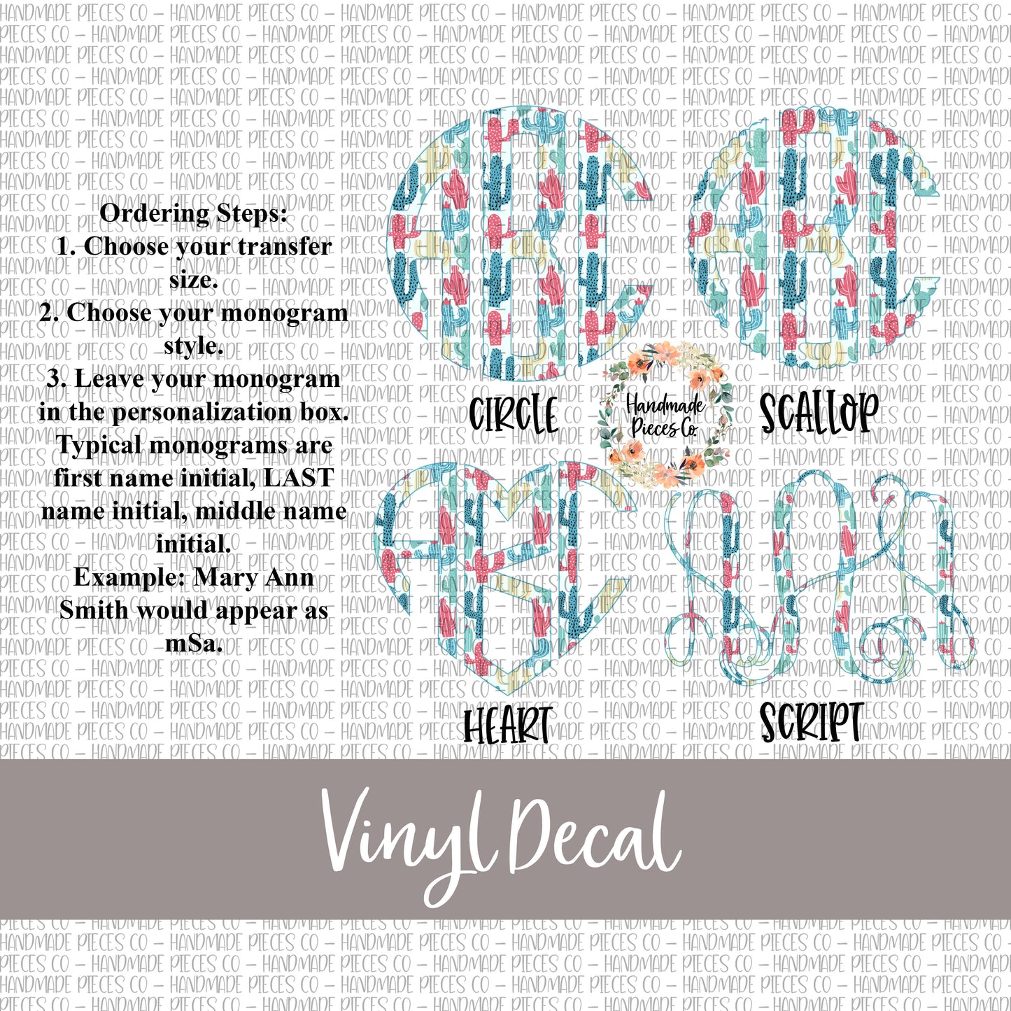 - Choose your monogram style from the drop down menu (circle, scallop, heart, or script).