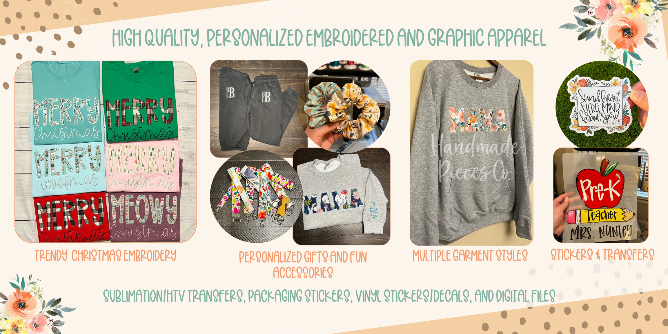 Welcome to Handmade Pieces Co! I have everything from vinyl and embroidered shirts, sublimation and HTV transfers, vinyl decals and stickers to digital downloads.