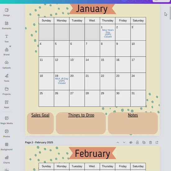 A digital twelve page Canva template with a 12 month 2026 calendar with holidays and USPS closures. Each page has one calendar month. All 2026 USPS closure days and holidays are noted along with other holidays to help your business plan.