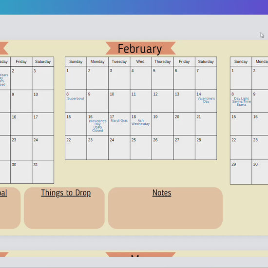 The fifth page in the Canva template contains a "Branding Guide" which allows you to change the text/colors easily, along with a finished month example. Free Canva elements and fonts are used in this template. However, your own upload fonts can be used if you have a Canva Pro Account. To maximize space and size, template size is 82in x 32in.