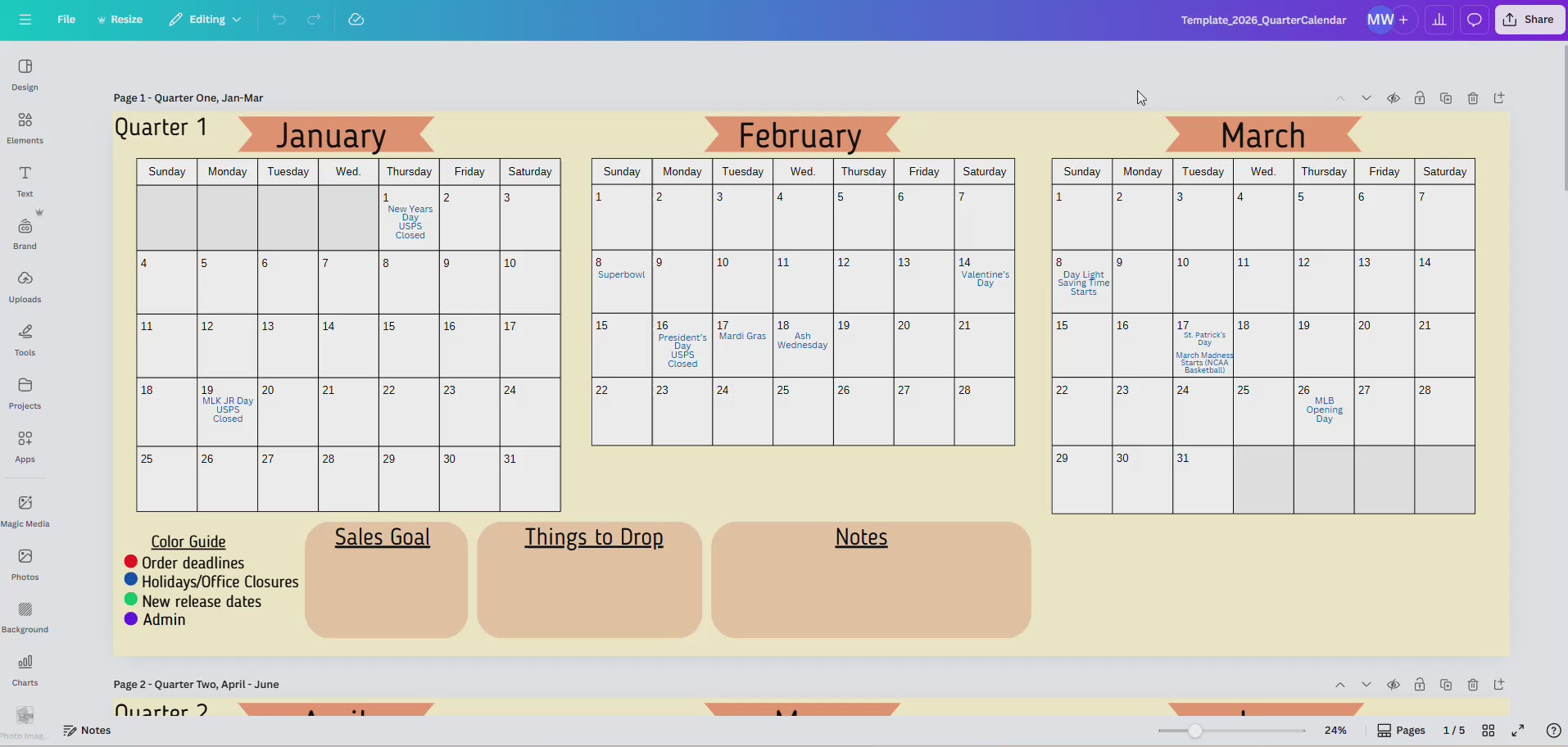 A digital four page Canva template with a 12 month 2026 calendar with holidays and USPS closures. Each page contains a 3 month view of the quarter. All 2026 USPS closure days and holidays are noted along with other holidays to help your business plan.