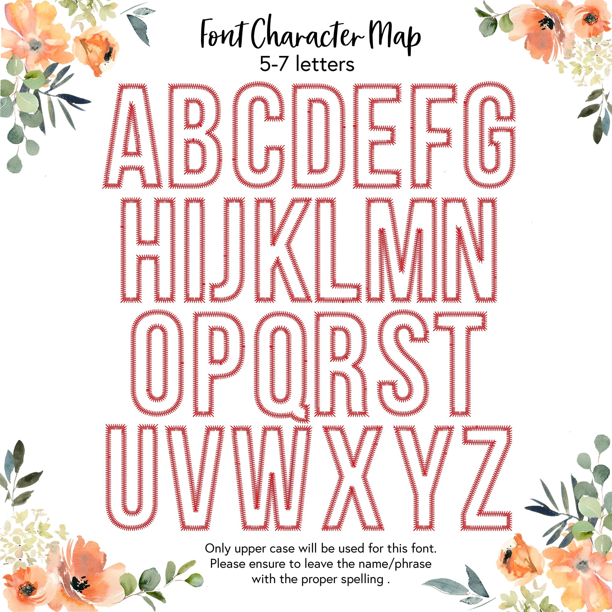 Up to four letters max for this diamond stitching style. If the main word is five to seven letters, a different font and a zig zag stitch style will be used instead.