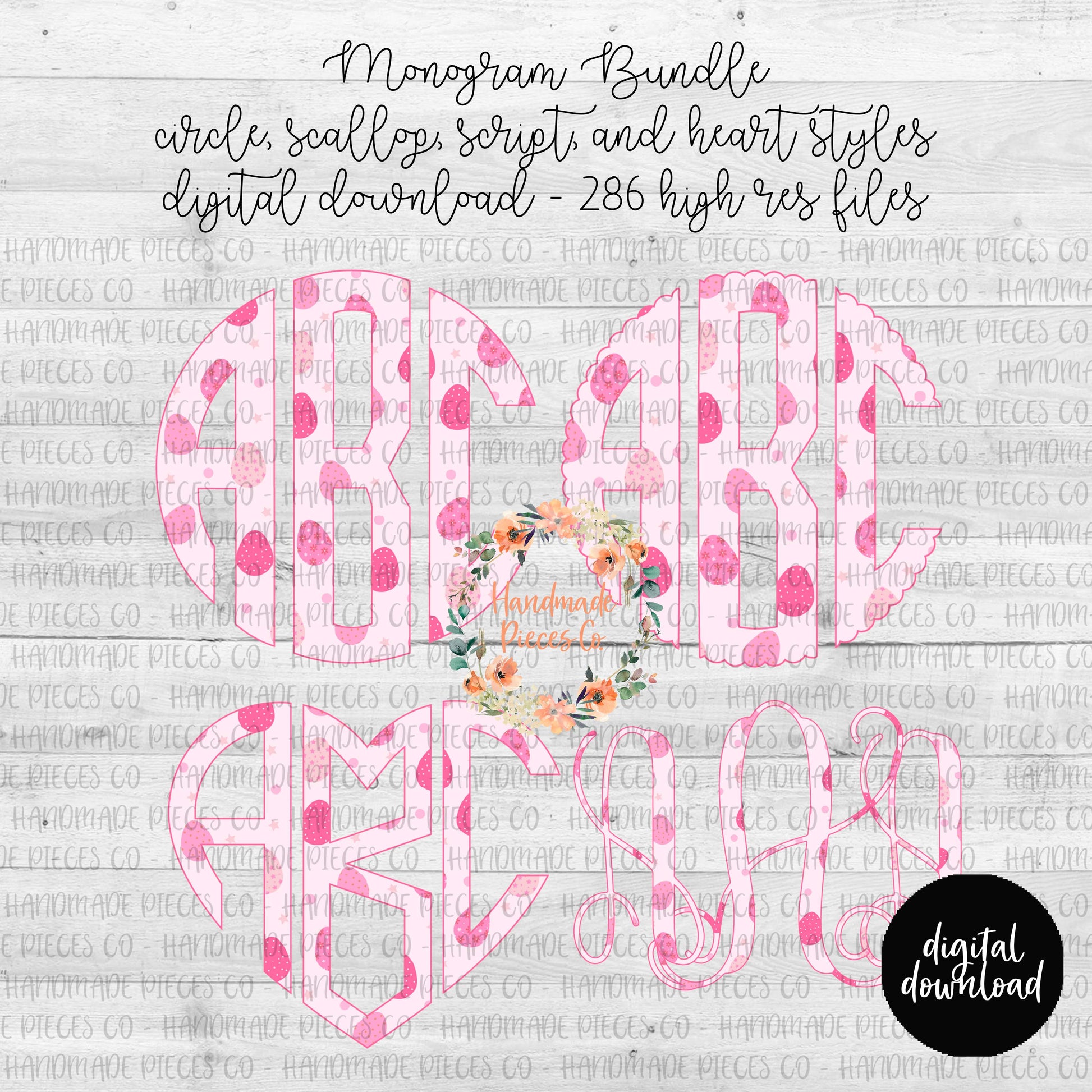 The circle, heart, and scallop monograms each have 78 PNG files per monogram (left, middle, and right for each letter).