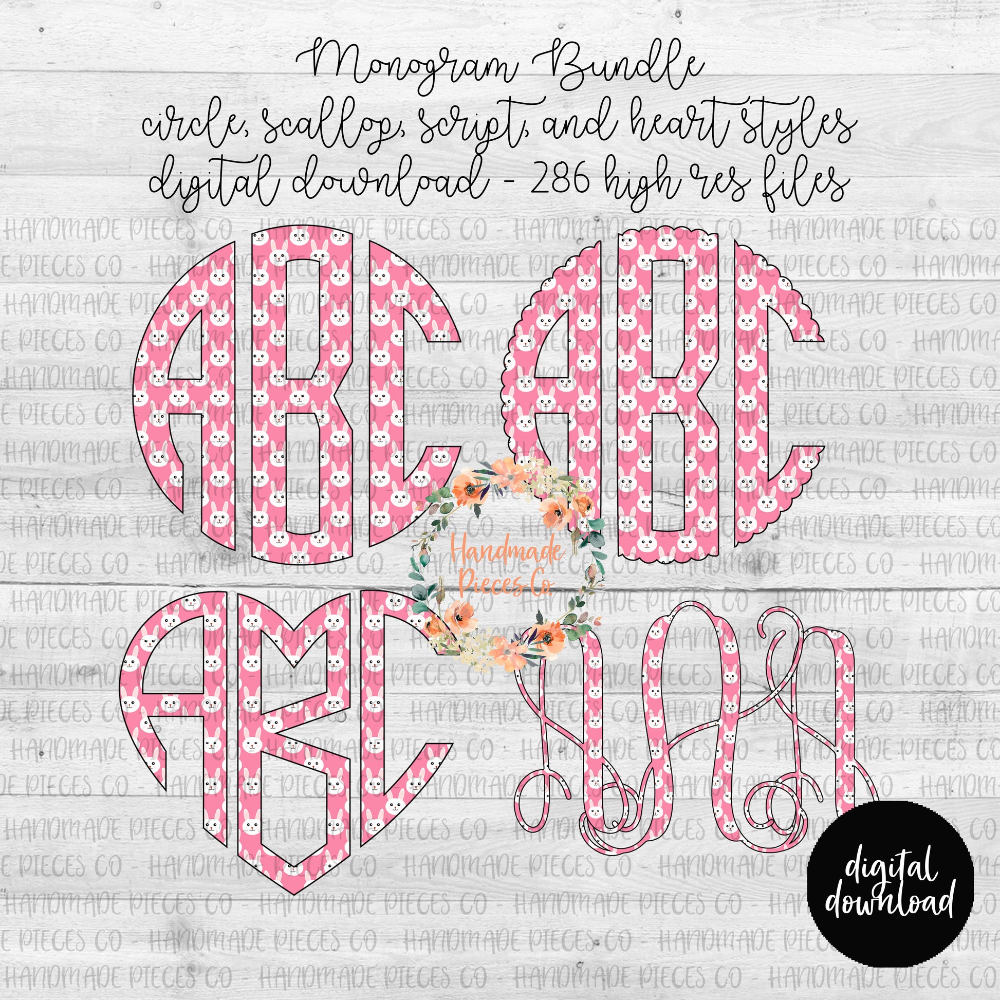 The circle, heart, and scallop monograms each have 78 PNG files per monogram (left, middle, and right for each letter).