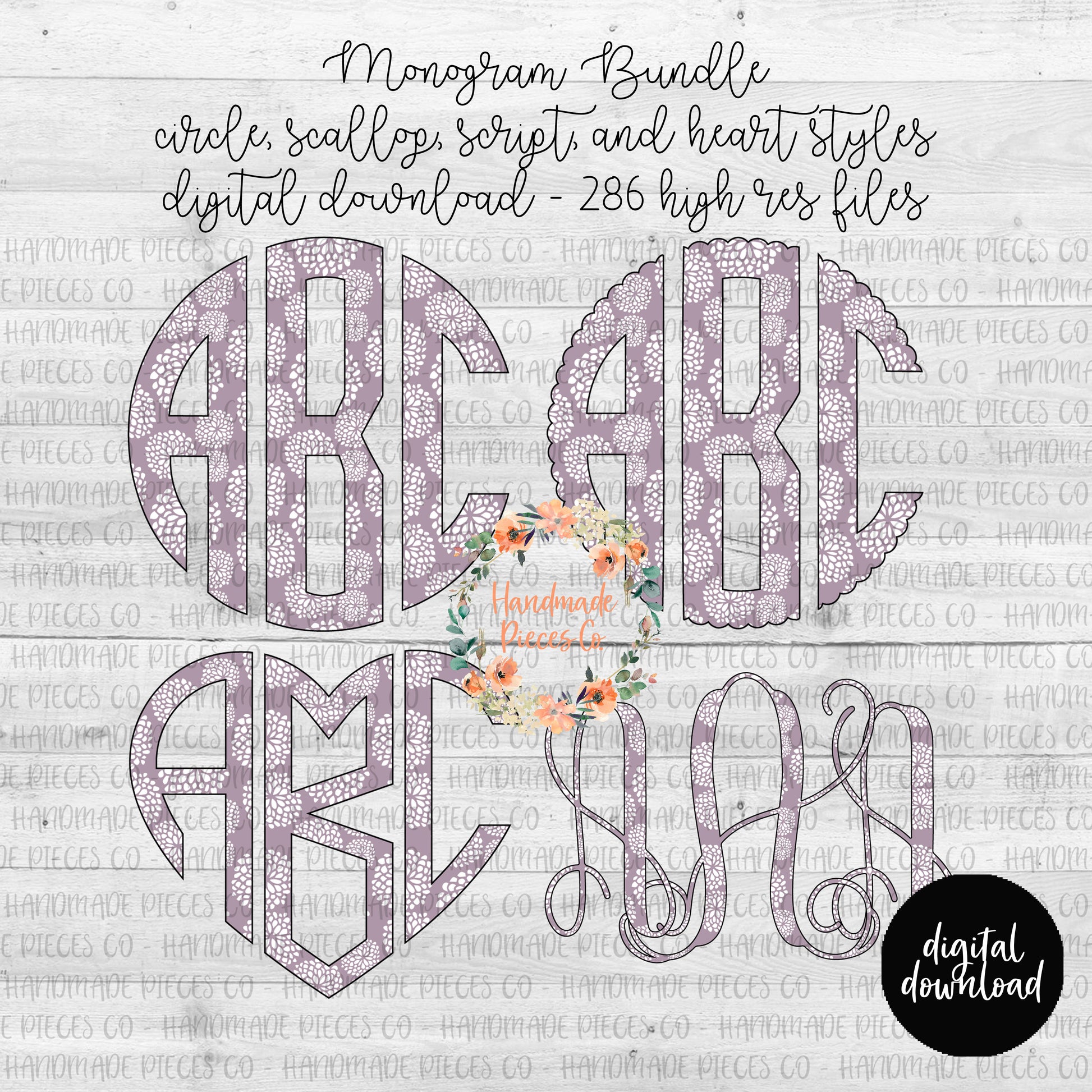 The circle, heart, and scallop monograms each have 78 PNG files per monogram (left, middle, and right for each letter).