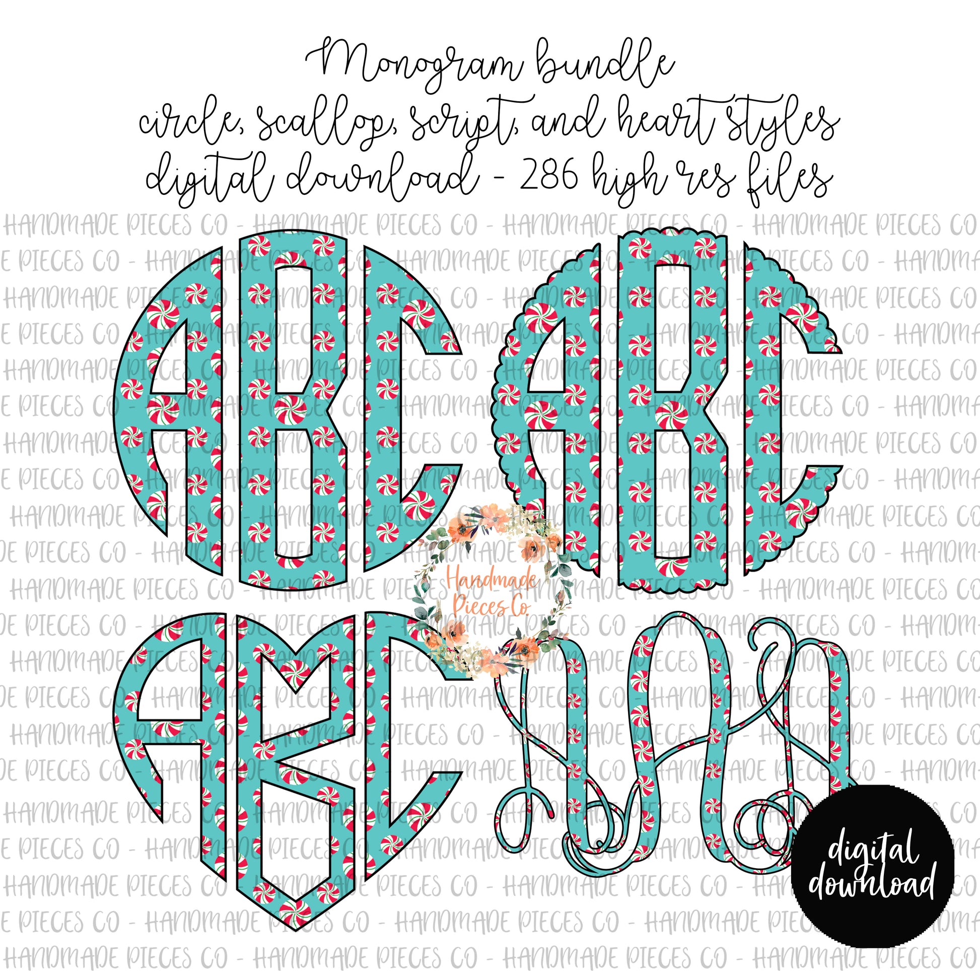 The circle, heart, and scallop monograms each have 78 PNG files per monogram (left, middle, and right for each letter).