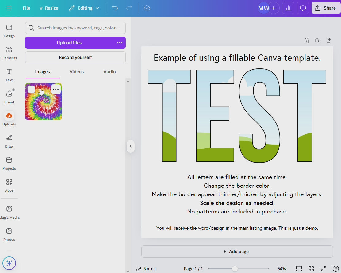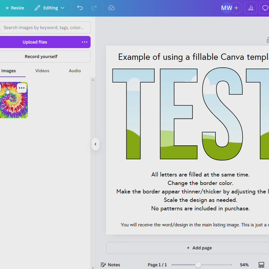 All templates are placed on a 12in x 12in design space and include a fillable template layer and a color changeable border layer. All letters are grouped together and will be filled with the same digital pattern. Each letter cannot be filled individually. Make your border appear thicker by dragging it to the front in the layer position tab or thinner by dragging it to the back.