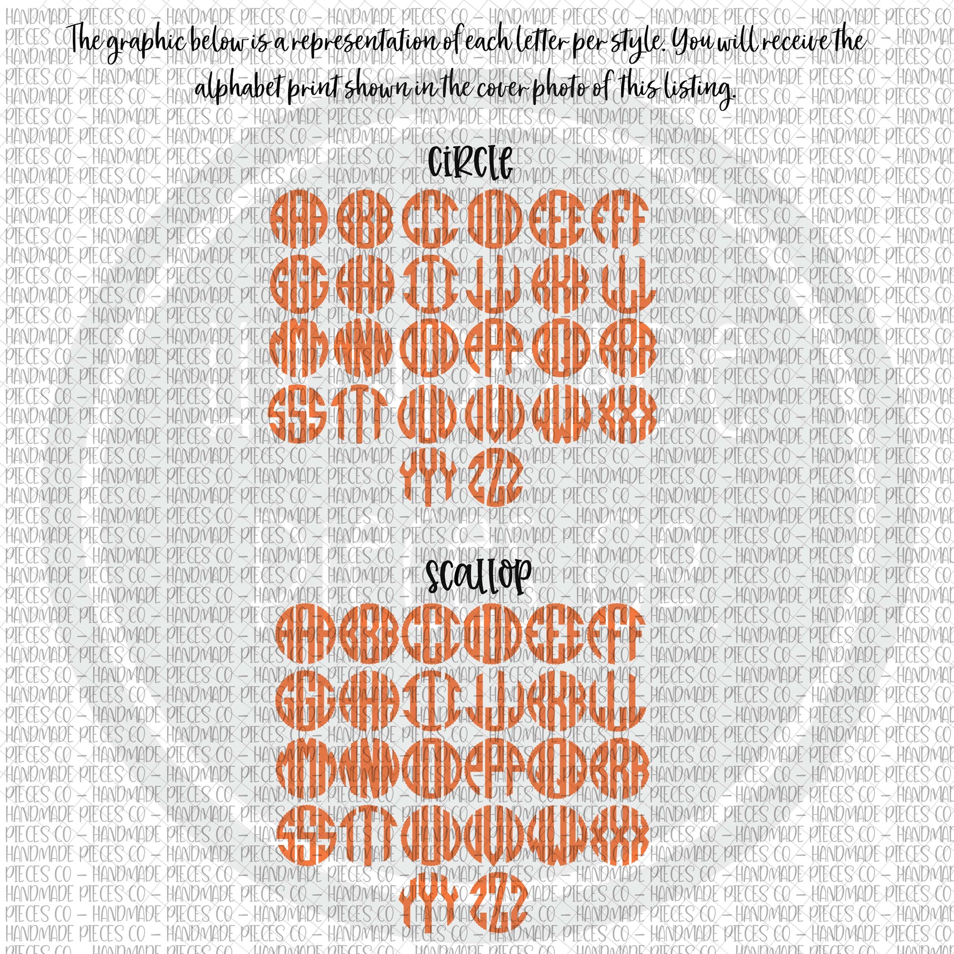 The circle and scallops monogram will each have 78 PNG files per monogram (left, middle, and right for each letter).